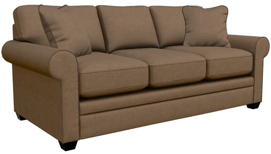 Rolled arms, decorative wood legs and welt trim lend laid-back sophisticated style